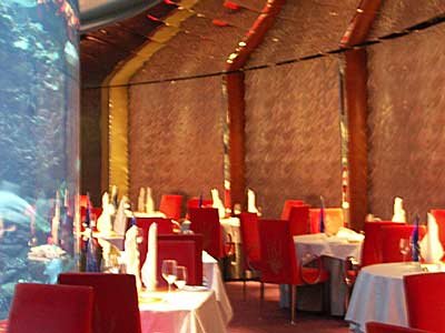 Dining at Al Mahara, one of the restaurants inside Burj Al Arab, starts with a three-minute simulated submarine descent. Then patrons enter and take their seats nearby a floor-to-ceiling saltwater aquarium at the center of the room.
